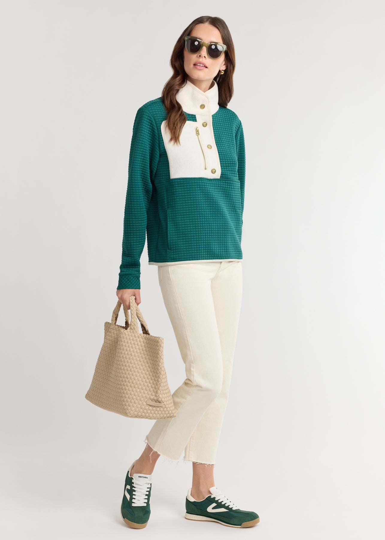 - Pullover style (now in a slightly shorter, more sporty fit) in recycled Waffle with Vello Fleece pocket and collar detail
