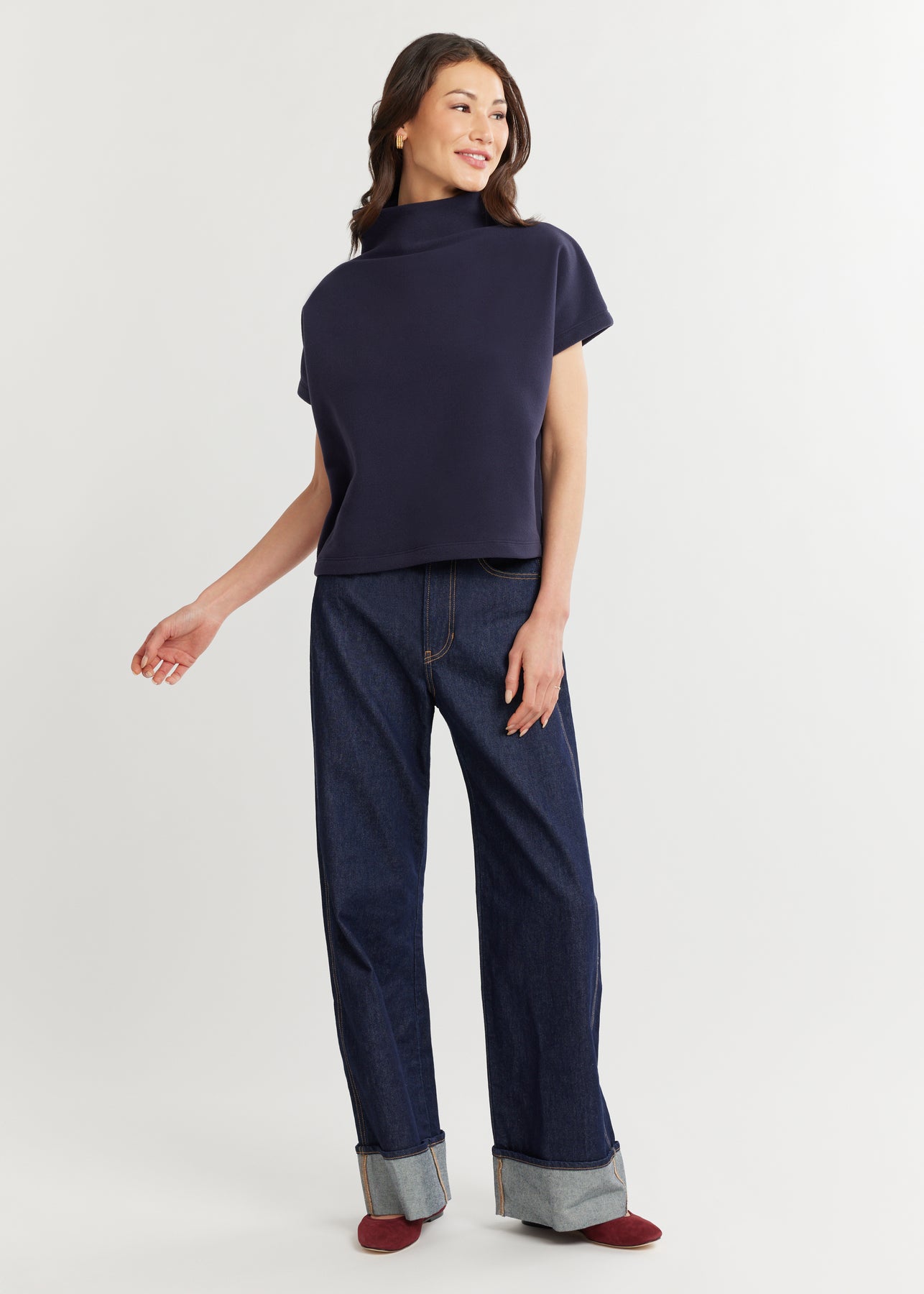 A statement collar for all seasons. We scaled back our signature stand-up neckline in a laid-back, short-sleeve style that gives dimension to transitional dressing.