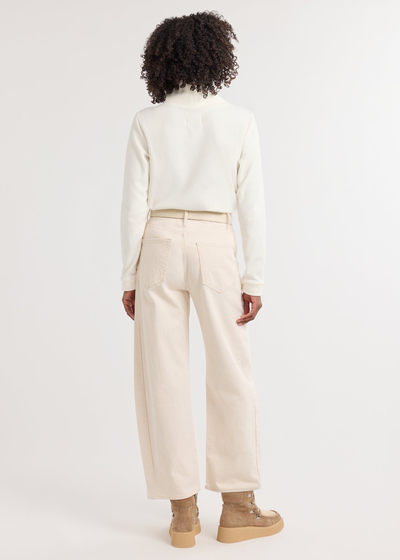 - Slightly roomy fit throughout body, hits at waist with banded hem