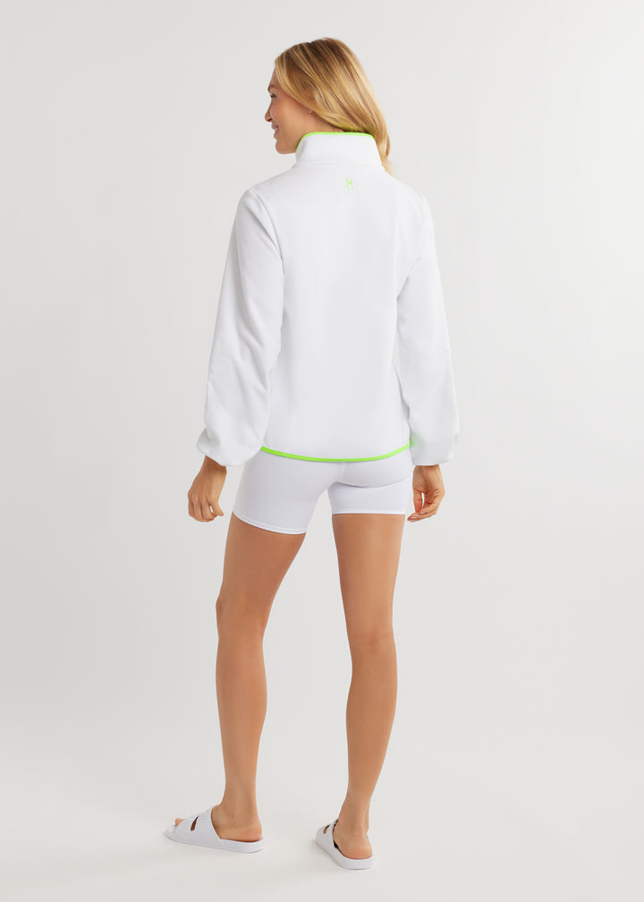 • Dudley Green knit binding at collar, pocket, bottom hem and cuffed sleeve; enamel zipper in white